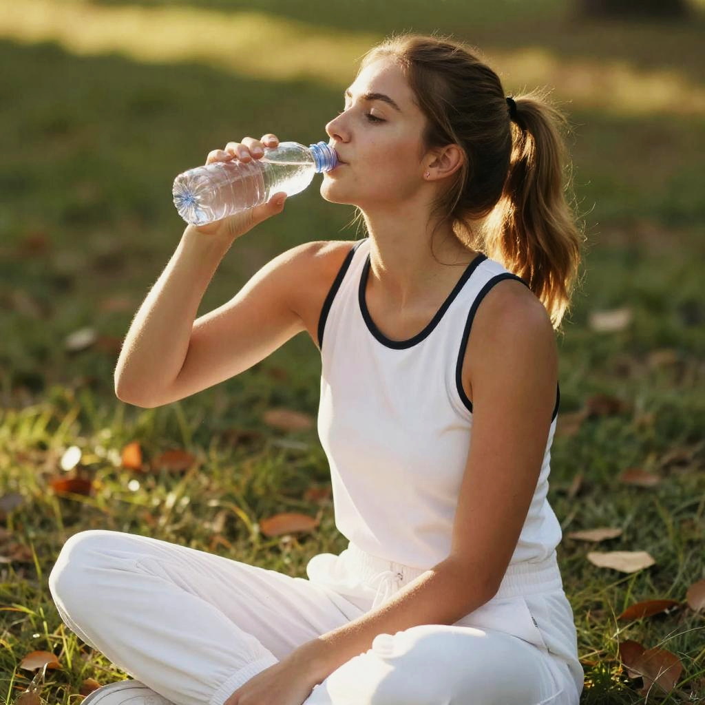 Photograph of a young woman with light brown hair in a ponytail, sitting cross-legged on a sunlit grassy area with fallen leaves. She's wearing a white sleeveless athletic top with black trim and matching white pants. She's drinking from a clear plastic water bottle, with sunlight highlighting her face and creating a warm, golden glow. The background is slightly blurred, emphasizing her in the foreground.