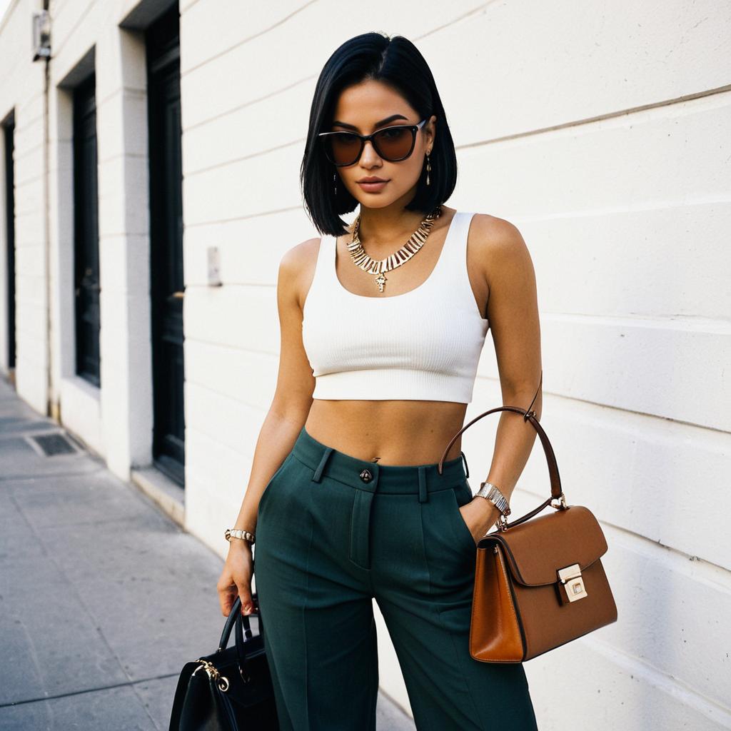 Young woman with olive skin and curly chestnut hair wearing sunglasses and a white crop top paired with high-waisted green pants. She accessorizes with a bold green necklace, hoop earrings, bracelets, rings, and carries a brown leather handbag. The street style scene features a confident posture and chic urban elegance, captured outdoors in a city environment with modern architecture in the background.