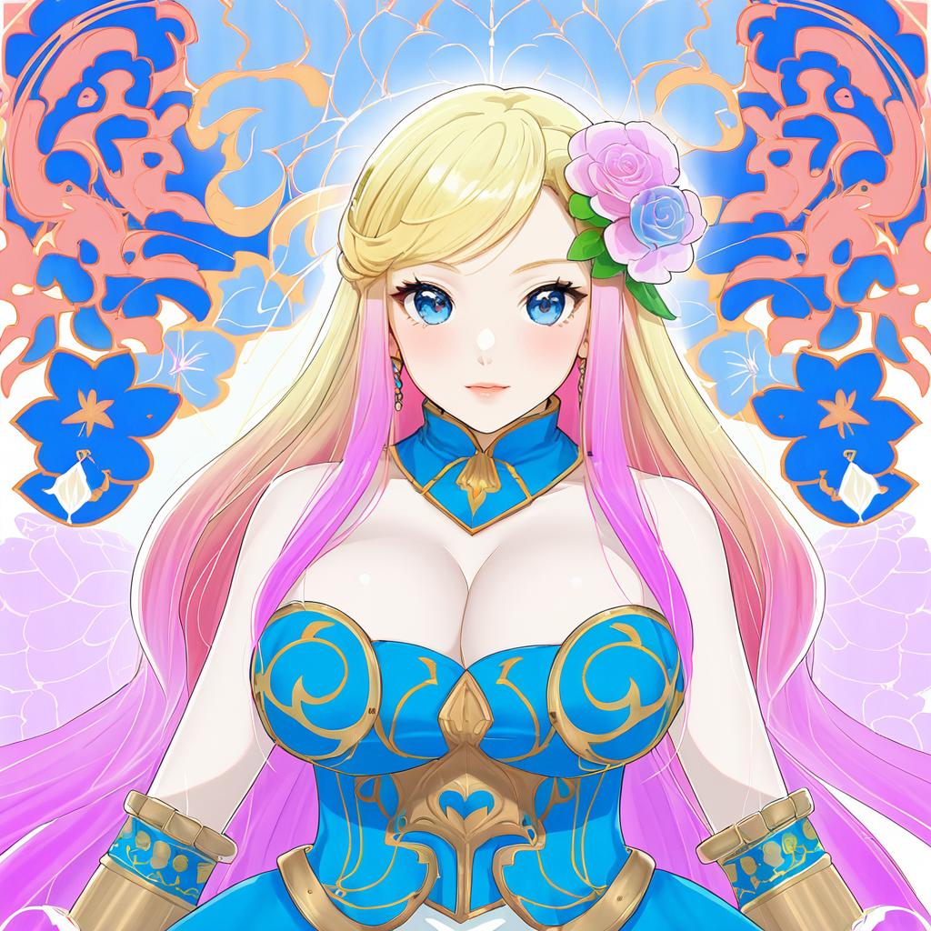 Digital anime-style artwork featuring a blonde girl with long pink gradient hair, decorated with a flower accessory. She has striking blue eyes, large breasts, and wears blue and gold ornate armor with a high collar. The background is decorated with intricate blue and orange floral patterns.