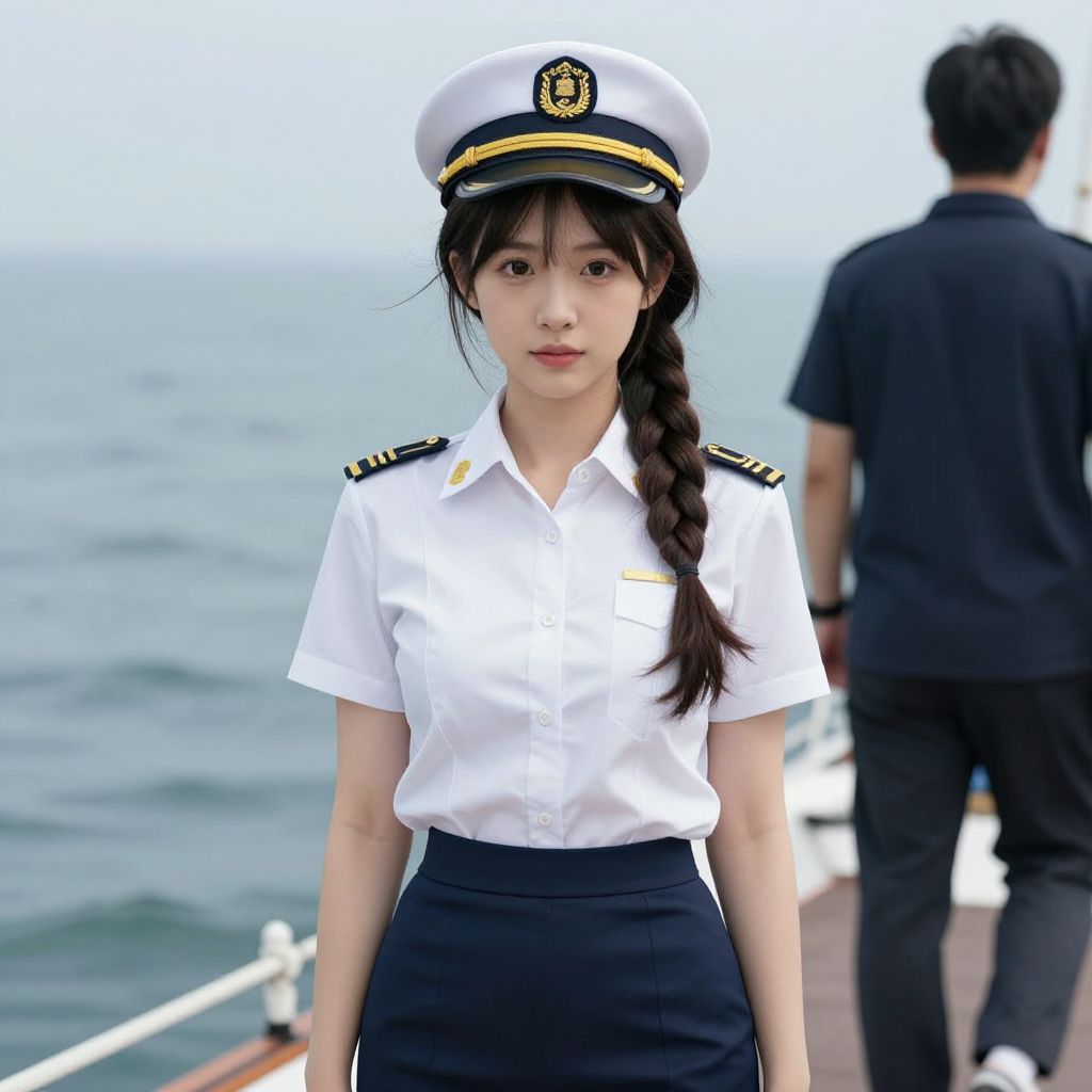 Photograph of an East Asian female naval officer with long braided black hair, white uniform, black skirt, and peaked cap, standing on a ship