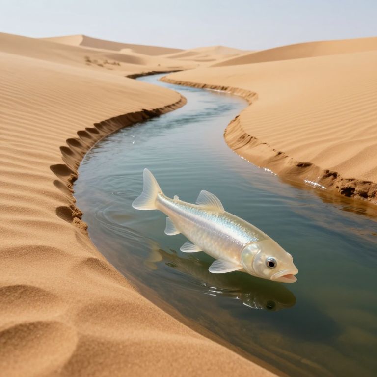 Fish with translucent skeletons swim gracefully upstream through a narrow, serene river that cuts through golden sand dunes, defying gravity in an otherworldly desert landscape.