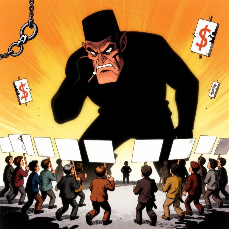 Dictator political cartoon portraying a ruthless despot as a giant shadow looming over a small group of protesters with placards, the scene filled with symbolic elements like shackles and broken democracy signs in a vivid comic style.