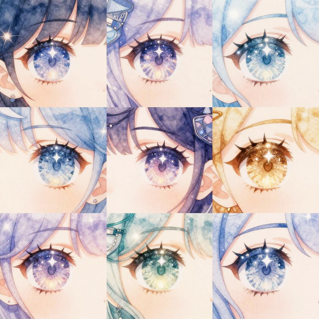 Digital watercolor art collage of nine anime-style female characters' eyes in various colors (blue, purple, brown, green), each with detailed, sparkling