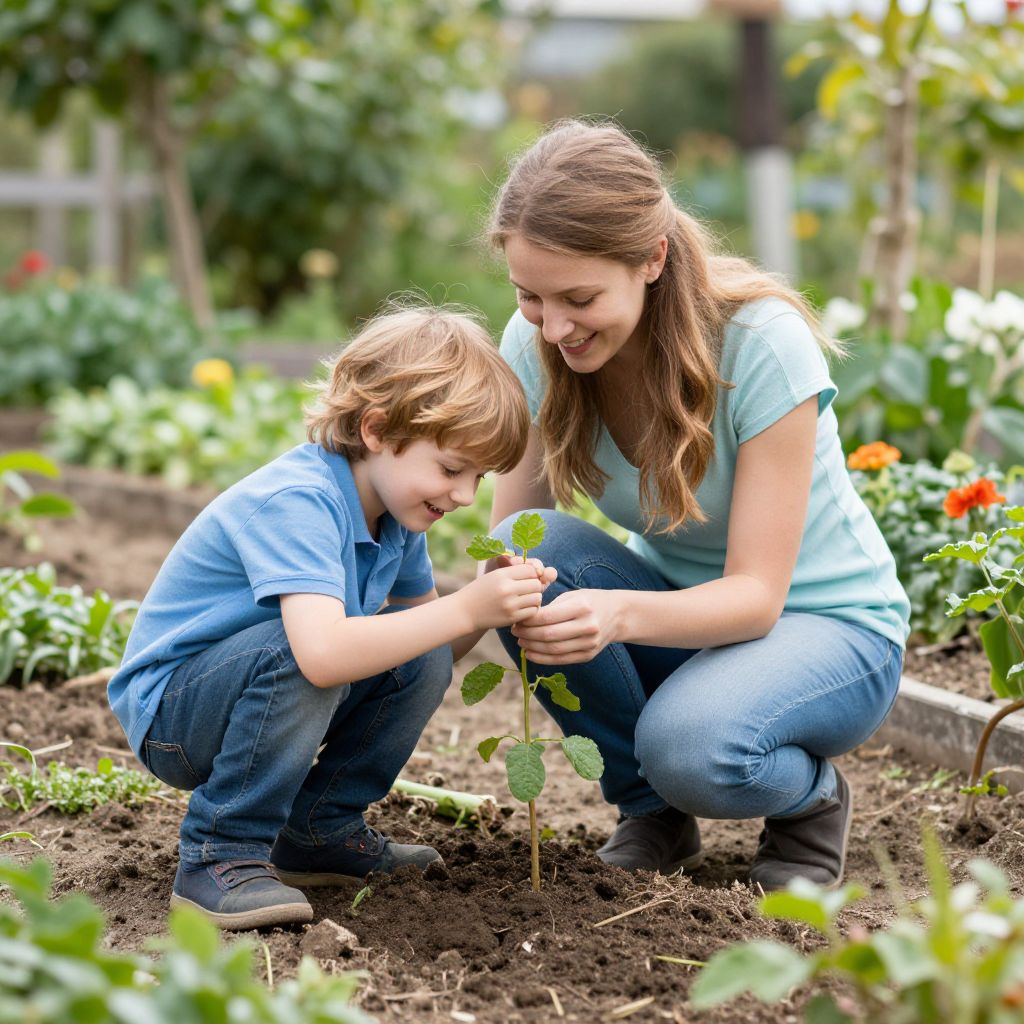 In a vibrant garden alive with the promise of growth, a tender bond blossoms between a young woman and her son, their shared laughter intertwining with the earthy scents of freshly tilled soil and the gentle rustle of leaves, embodying the timeless rhythm of connection and renewal.