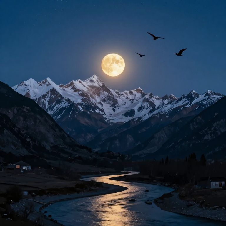 Photograph of a nighttime mountain landscape featuring a bright full moon illuminating snow-capped peaks. Three birds fly near the moon in a clear, deep blue sky. A reflective river winds through the dark valley below, with a few small houses visible on the left and right. The moon's light casts a serene glow over the scene, highlighting the rugged mountain textures and creating a tranquil, almost magical atmosphere.
