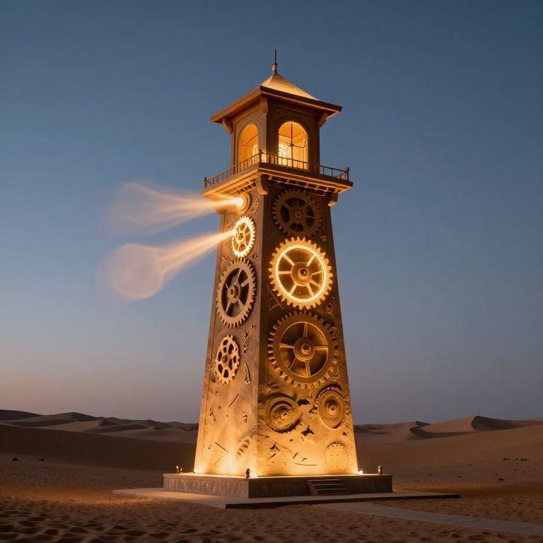 An ancient clocktower in the center of a desert glows with living gears composed of sand, wind, and sunbeams that rewind time only for those who believe.
