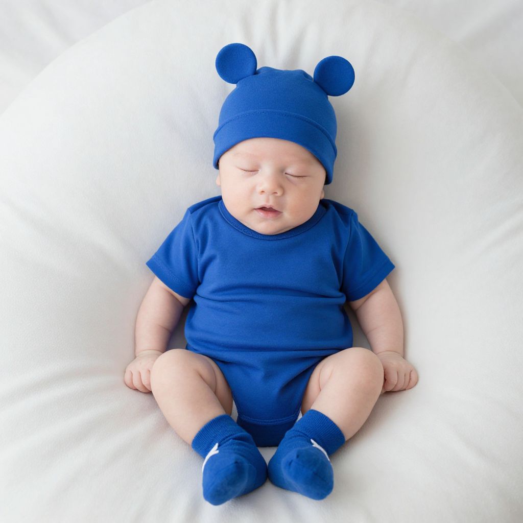 Newborn Clothing Costume, baby sitting on a bed wearing a blue hat