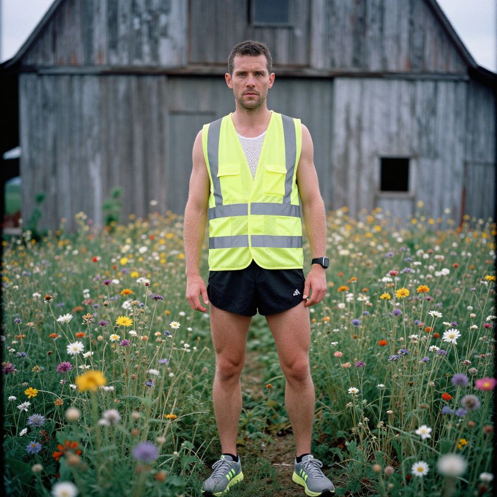 A man, wearing a neon yellow reflective vest, black moisture-wicking running shorts, white breathable mesh tank top, gray running shoes with neon accents, wildflower fields, weathered barn with peeling paint, lomography analog photo, focused expression, vibrant colors, soft bokeh. Man has masculine face and piercing eyes