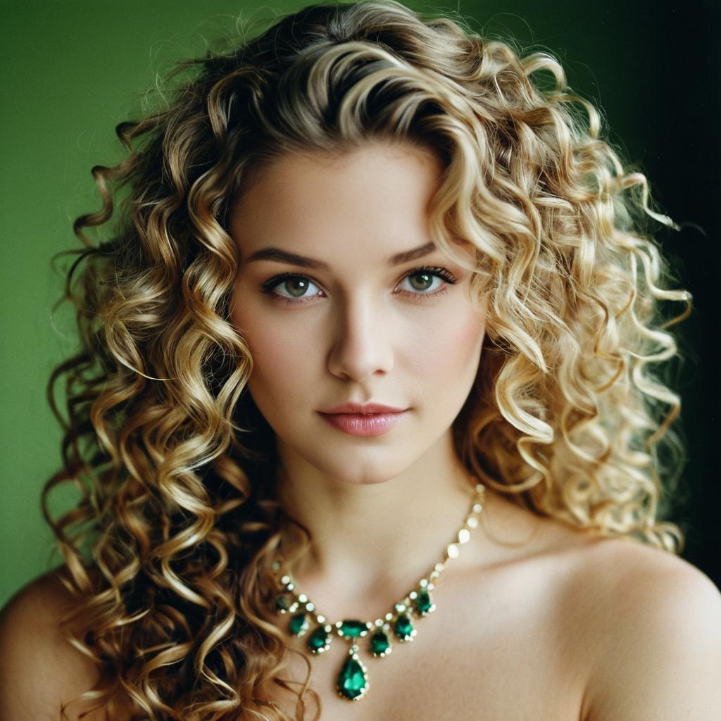 Portrait of a young woman with brown curly hair highlighted with lighter tones, green eyes, and natural makeup. She is wearing a black lace bra with visible straps, posing against a green background. The focus is on her upper body and face, highlighting her curls and facial features.