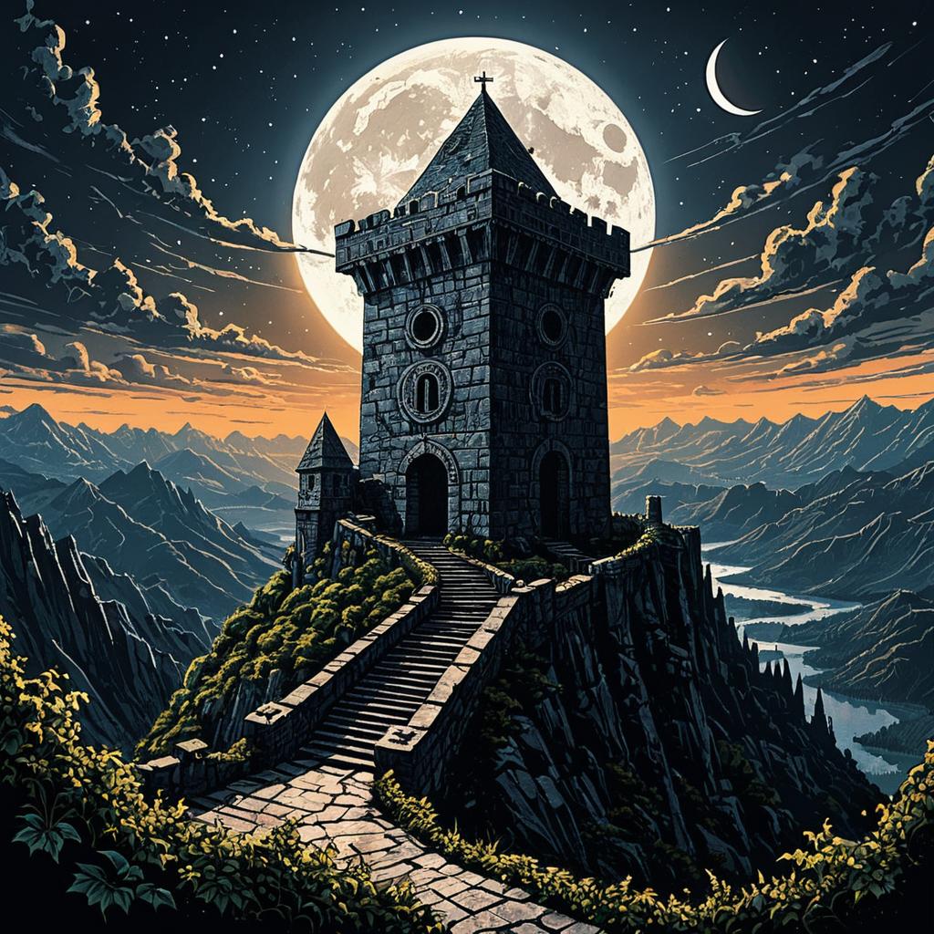 Illustration of one of the Bastion of Endless Twilight from the Forgotten Realms, similar to classic Dungeons & Dragons handbooks. The tower reaches high into a sky that is filled with the drama of an eternal eclipse, its stone facade adorned with dual-toned cryptic runes entwined with ivy. The landscape surrounding the tower features stark, craggy mountains, suggesting its remote and inaccessible nature. Magical energies seem to shimmer in the air around the tower, and the sky is detailed with fine lines and cross-hatching, enhancing the surreal and timeless effect of the eclipse lighting.