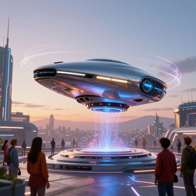 Antigravity device floating above a futuristic cityscape at dusk, sleek metallic surfaces glowing softly, with people in vibrant clothing marveling, intricate glowing energy fields surrounding the device, highly detailed sci-fi environment, cinematic lighting.