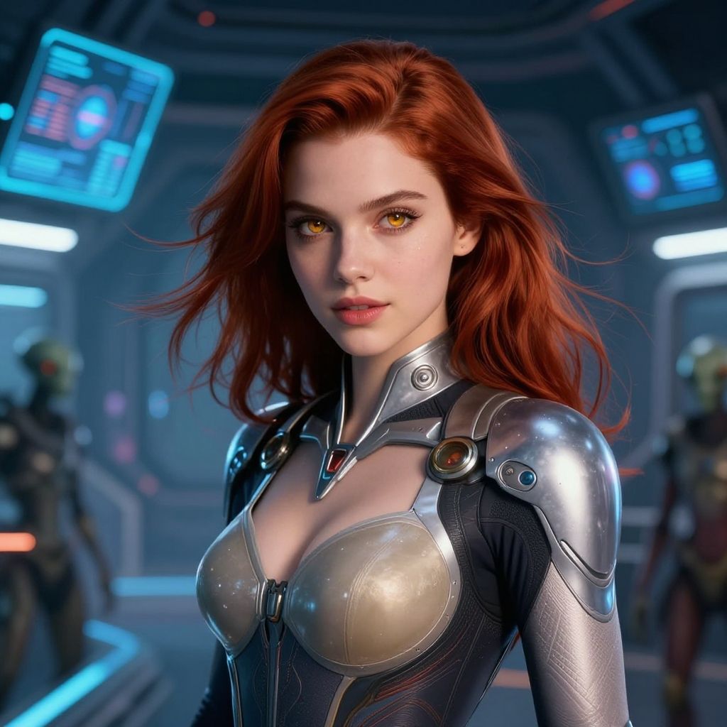 Photorealistic CGI of a red-haired woman with fair skin and striking amber eyes, standing in a futuristic, dimly-lit space. She wears a metallic, form-fitting suit with a silver breastplate accentuating her ample cleavage, and black armored sections on her arms and chest. Her wavy hair flows freely. In the background, blurred figures in similar futuristic armor are visible, along with glowing blue and red digital screens on the walls. The setting suggests a sci-fi environment, possibly a spaceship or high-tech facility. The image has a glossy, high-detail finish.