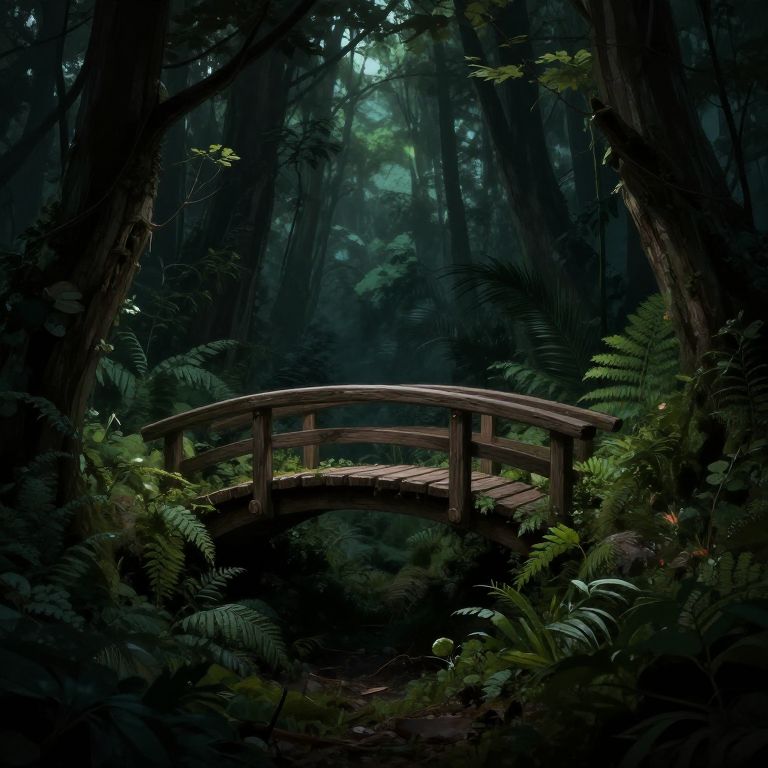 Photograph of a serene forest scene featuring a small, wooden, arched bridge centered in the image. The bridge, with its rustic, weathered appearance, is surrounded by dense foliage including ferns and various green plants. The forest is shadowy, with tall trees creating a canopy that allows beams of soft, diffused light to penetrate the darkness. The overall color palette is dark green and blue, with the bridge standing out slightly lighter due to its wooden texture. The background is dense with trees, adding to the secluded, tranquil atmosphere. The image evokes a sense of peace and hidden beauty in nature.