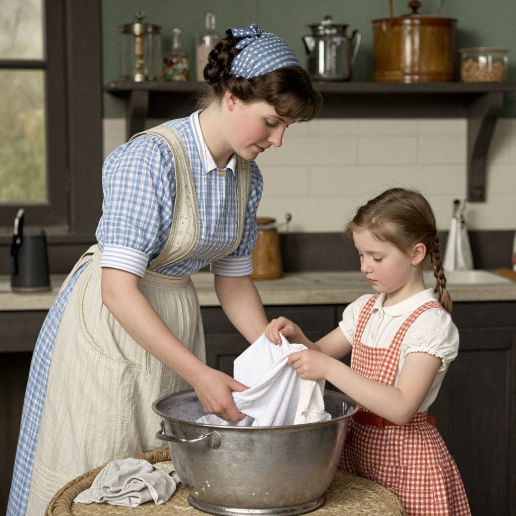 A vintage-style illustration depicts a tender moment between a woman in a traditional apron and a young girl, as they engage in the domestic chore of washing clothes in a rustic kitchen setting, evoking the nostalgic charm of George Dunlop Leslie's \"This Is The Way We Wash Our Clothes.\