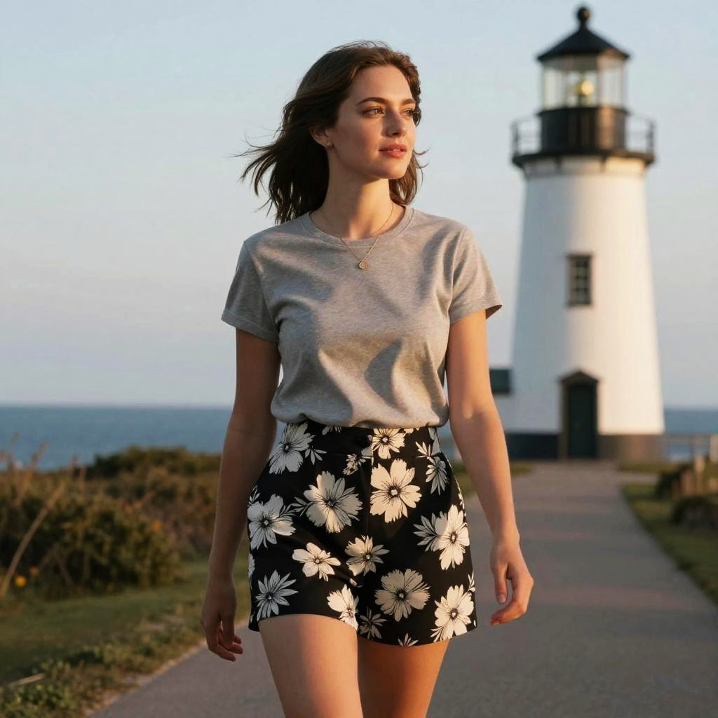 A Svelte woman in a casual chic outfit, wearing a heather gray t-shirt and elegant black and white floral shorts, accessorized with a thin gold pendant necklace, enjoying an evening walk by the lighthouse in a Tuttle Publishing visual style. Sexy. Pretty face and beutiful eyes
