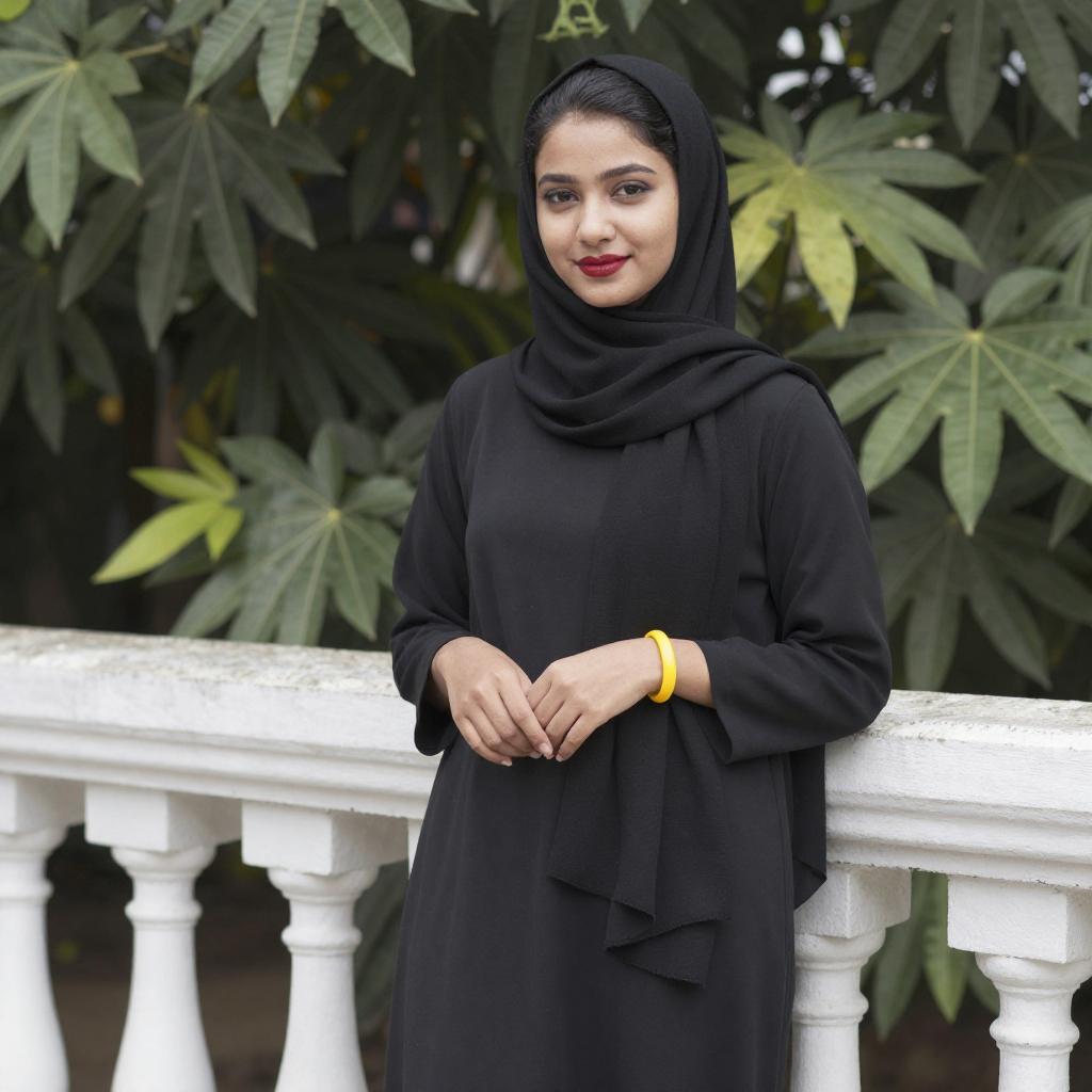 Photograph of a young woman with light brown skin and dark hair, wearing a black long-sleeve dress and matching hijab. She stands outdoors against a lush green leafy background, with a white balustrade in the foreground. She has red lipstick, a yellow bracelet on her right wrist, and gazes directly at the camera with a slight smile.