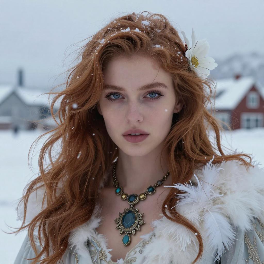 Realistic photography, closeup of one beautiful woman with friskles and, head shot, 25yo, focus on eyes, 50 mm f1.4, ginger hair in wind, hdr masterpiece, dramatic lighting, epic, arctic dress, flower in hair, white fur and feathers, light snowing, Arctic city, epic necklace