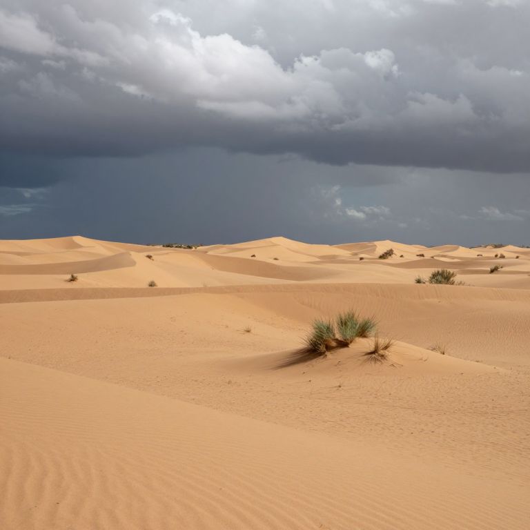 Sand dunes stretch endlessly beneath a dramatic sky, where dark, brooding clouds loom above, casting shadows over scattered mounds of earth and sparse vegetation in a vast, arid landscape.