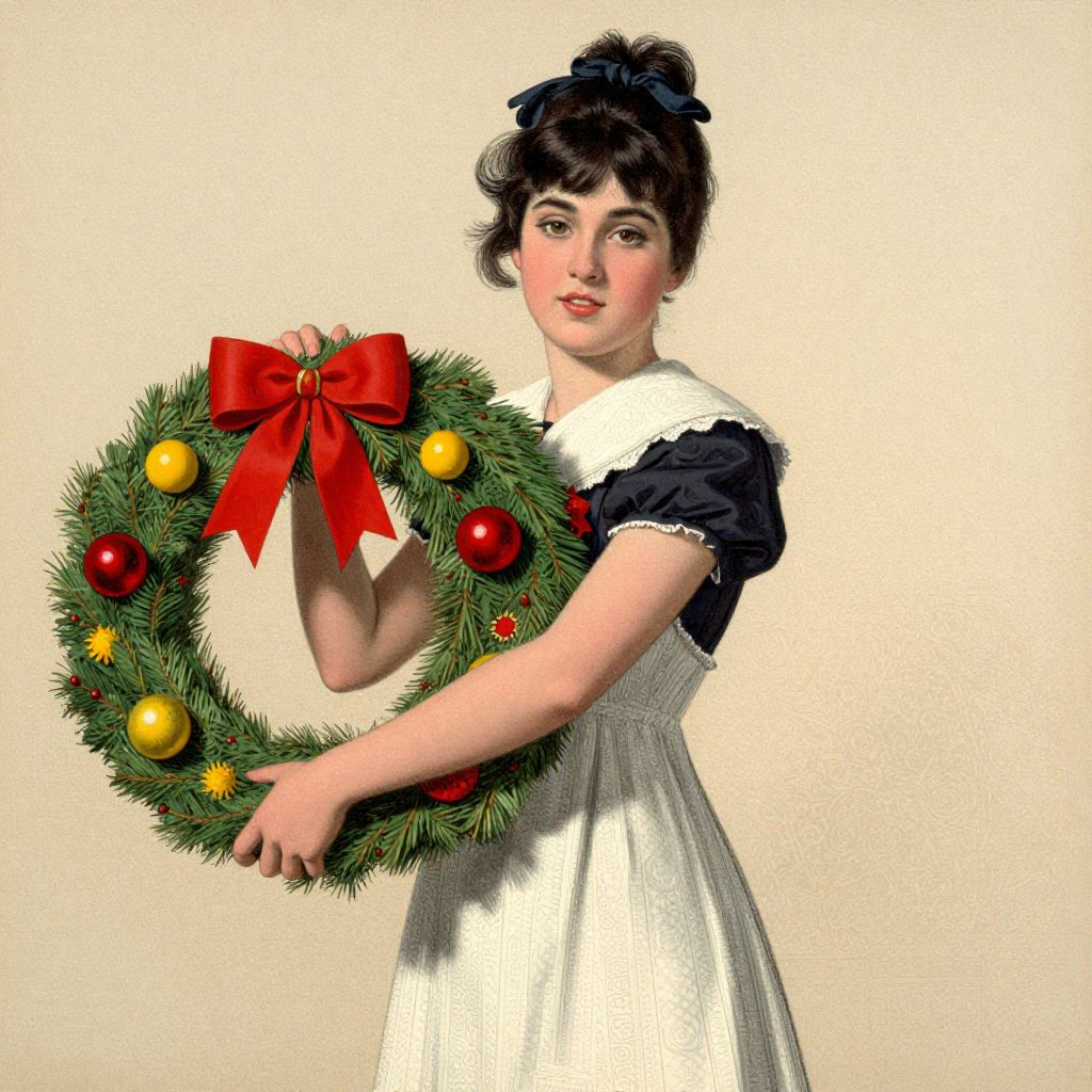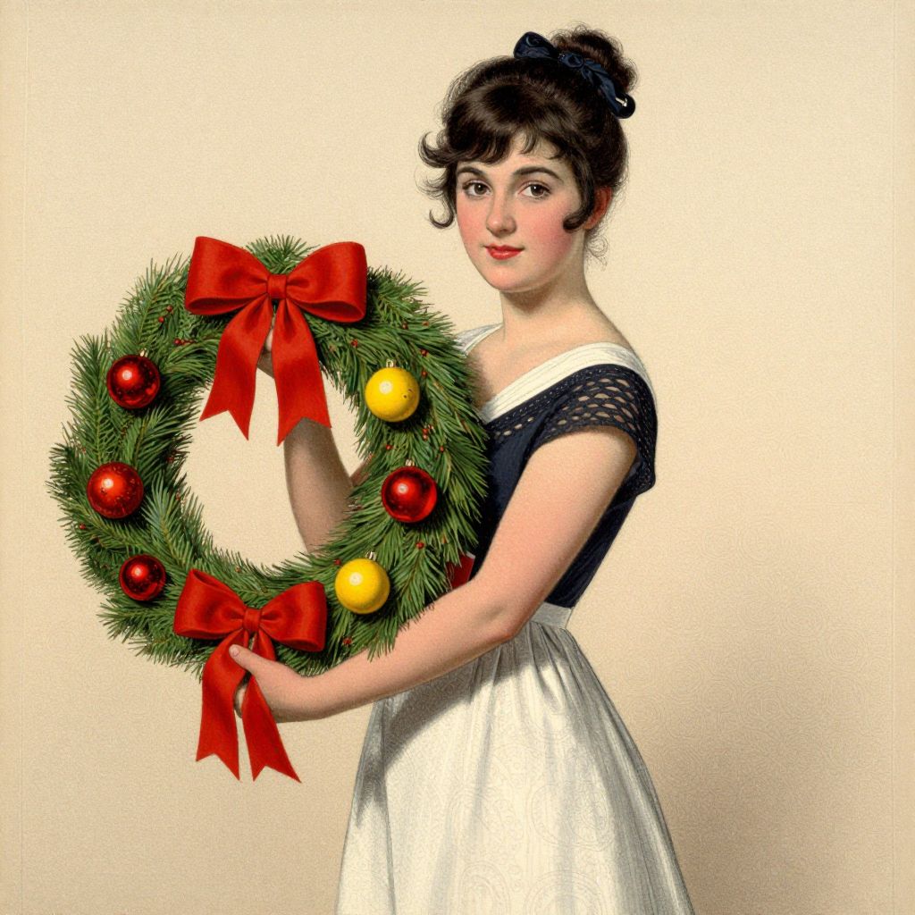 A vintage 1912 fadeaway girl illustration by Coles Phillips, rendered in a classic photolithograph style, depicts a charming young woman holding a festive Christmas wreath adorned with red and yellow ornaments and a vibrant red bow, set against a textured beige background with subtle patterned details.