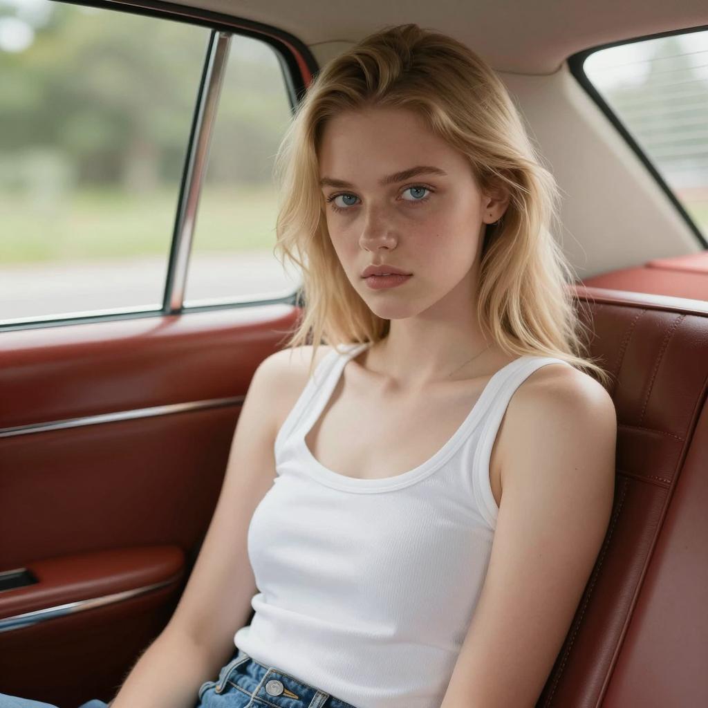 Young woman with light blonde hair, blue eyes, and fair skin, wearing a white tank top, sits in the backseat of a vintage car with red and brown interior. She has a serious, intense expression. Background shows a green, blurred outdoor scene through the car window.