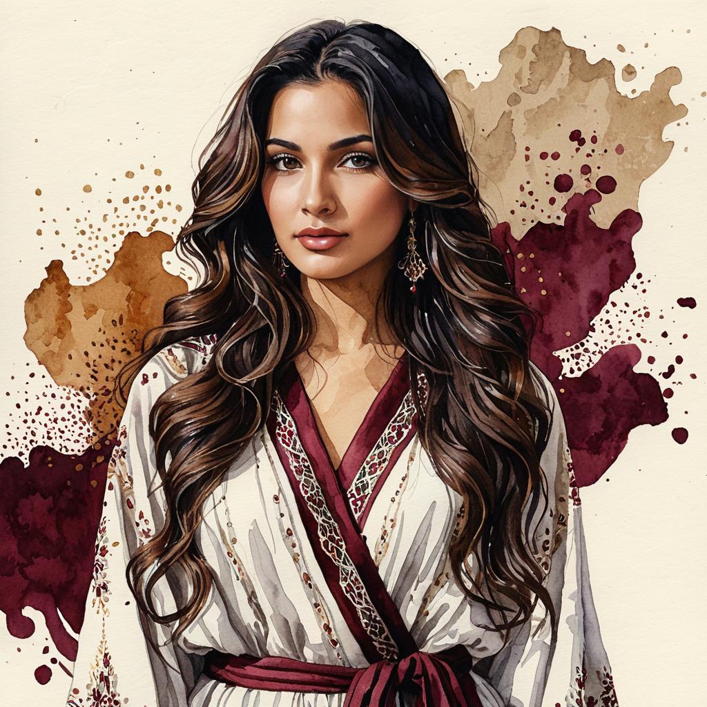 A detailed watercolor illustration of an elegant Middle-Eastern woman with long, wavy dark hair. She is wearing a flowing, embroidered robe with intricate patterns in white and maroon tones. The background features textured paper with warm maroon and brown watercolor splashes, adding an artistic and sophisticated atmosphere to the portrait.