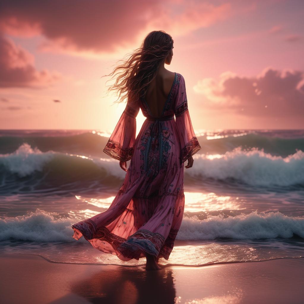 A photorealistic image of a woman in a bohemian dress, standing with her back to crashing waves on a beach, dramatic lighting, cinematic pink sky, backlit by the sun. Hyper-realistic, 8K resolution, flowing hair, and vibrant tones