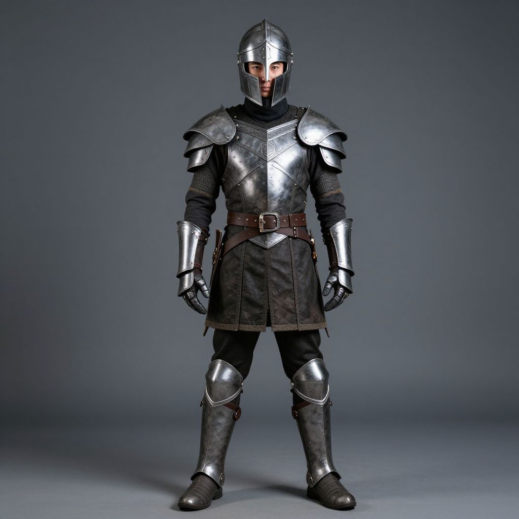 Photorealistic CGI of a medieval knight in full silver armor with a black tunic, brown belt, and helmet, standing against a gradient gray background