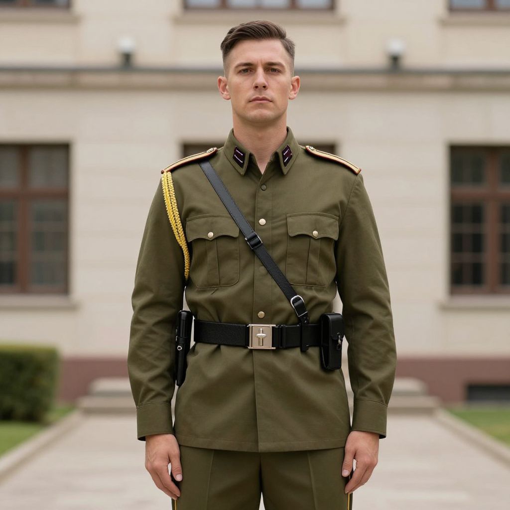 "Military Uniform Costume, man in uniform standing in front of a building"