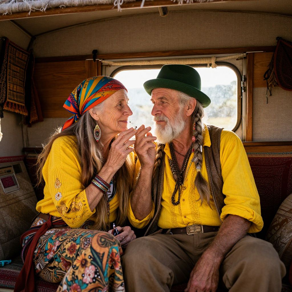 In a rustic, vintage caravan wagon, a 75-year-old hippie couple sits closely, their faces etched with wisdom and a hint of wear. The man, adorned with a white beard and braided hair, wears a vibrant yellow shirt and a green hat, while the woman, with long, flowing hair, sports a colorful headscarf and intricate earrings. They share a cigarette, their hands and faces illuminated by the warm, incandescent light filtering through the window. The interior of the wagon is a tapestry of textures and colors, with wooden panels, fabric hangings, and an old-fashioned radio adding to the nostalgic ambiance. The composition is dynamic, with the couple positioned centrally, their gazes meeting in a moment of shared understanding. The scene is meticulously detailed, with every fiber of their clothing, the grain of the wood, and the folds of the fabric rendered with hyper-realistic precision. The lighting is soft yet vibrant, casting gentle shadows that enhance the depth and realism of the scene. The overall effect is one of timeless beauty, captured in a moment of intimate connection within a world that feels both familiar and surreal.