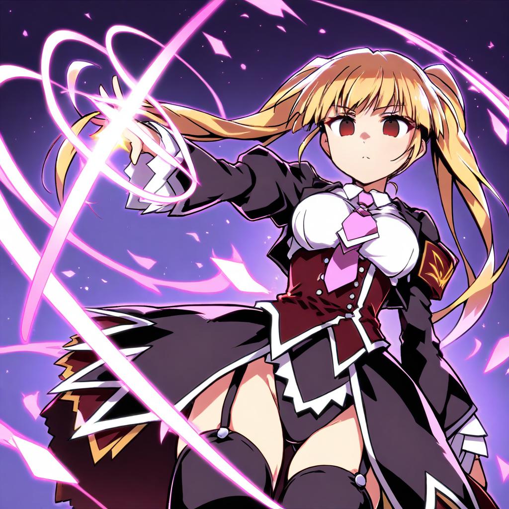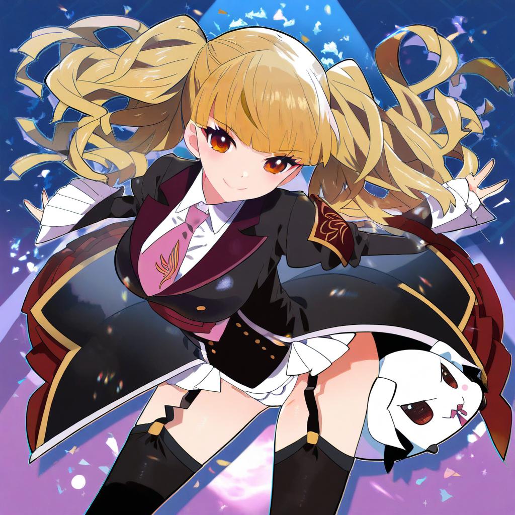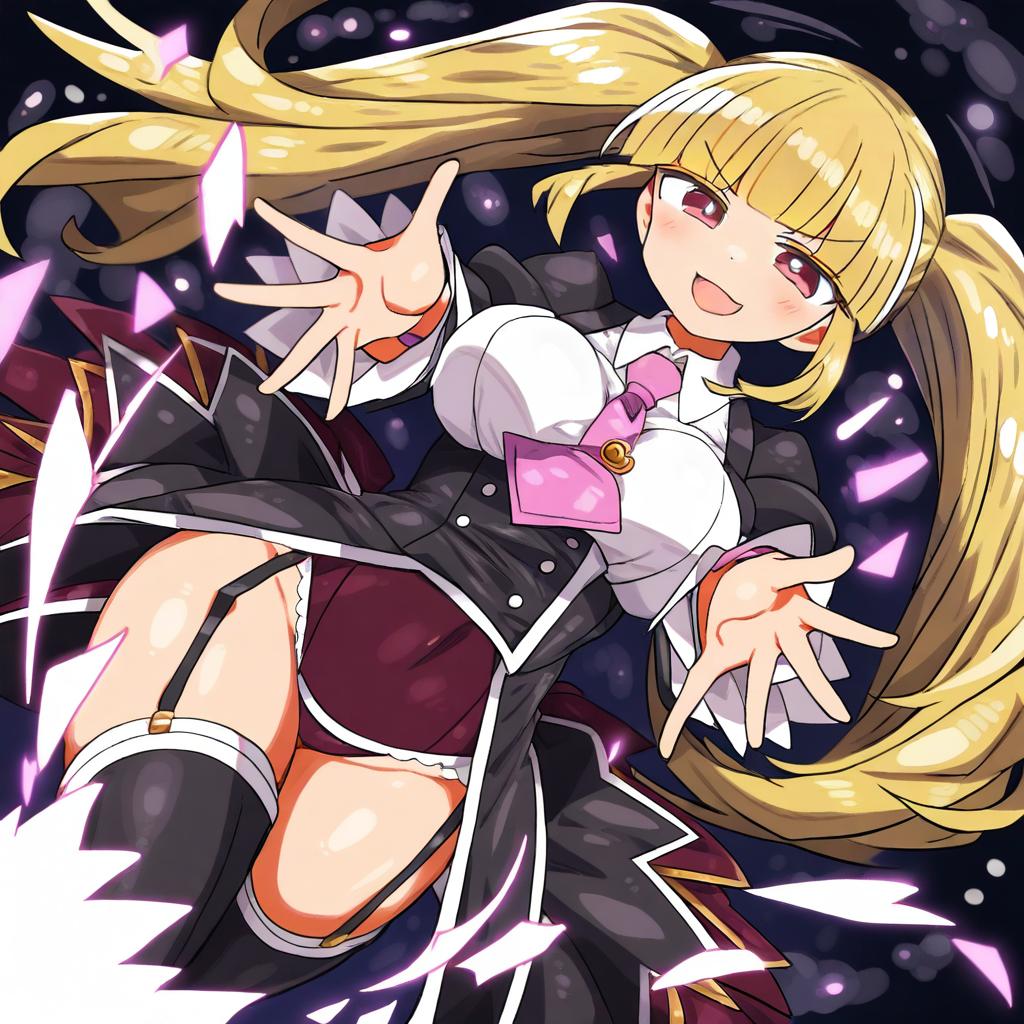 Asmodeus (umineko), umineko no naku koro ni, 1girl, red eyes, blonde hair, long hair, twintails, showgirl skirt, thighhighs, pink necktie, garter straps, by artist tomoshibi hidekazu, animagine