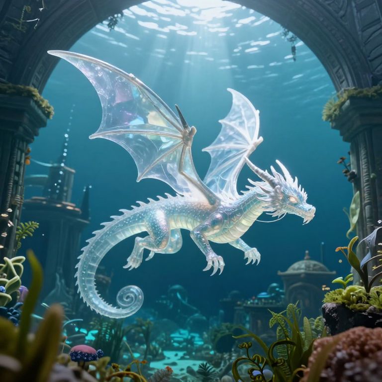 A translucent dragon glides gracefully through an ethereal underwater cityscape, its crystalline wings shimmering as it navigates between ancient stone arches and verdant aquatic plants, creating a surreal blend of mythical creature and submerged metropolis.