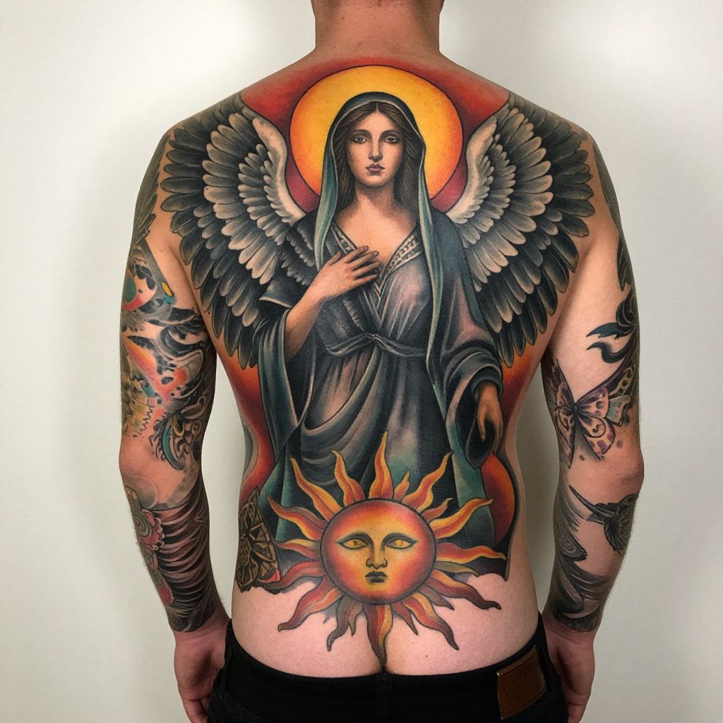 Photograph of a tattooed man facing away, showcasing a vivid, full-back tattoo of a serene woman with a halo, dressed in dark robes, surrounded by large, detailed wings and a sun-like creature at the bottom. His arms are heavily tattooed with colorful, intricate designs. The background is a plain, white wall, highlighting the vibrant artwork on his skin.