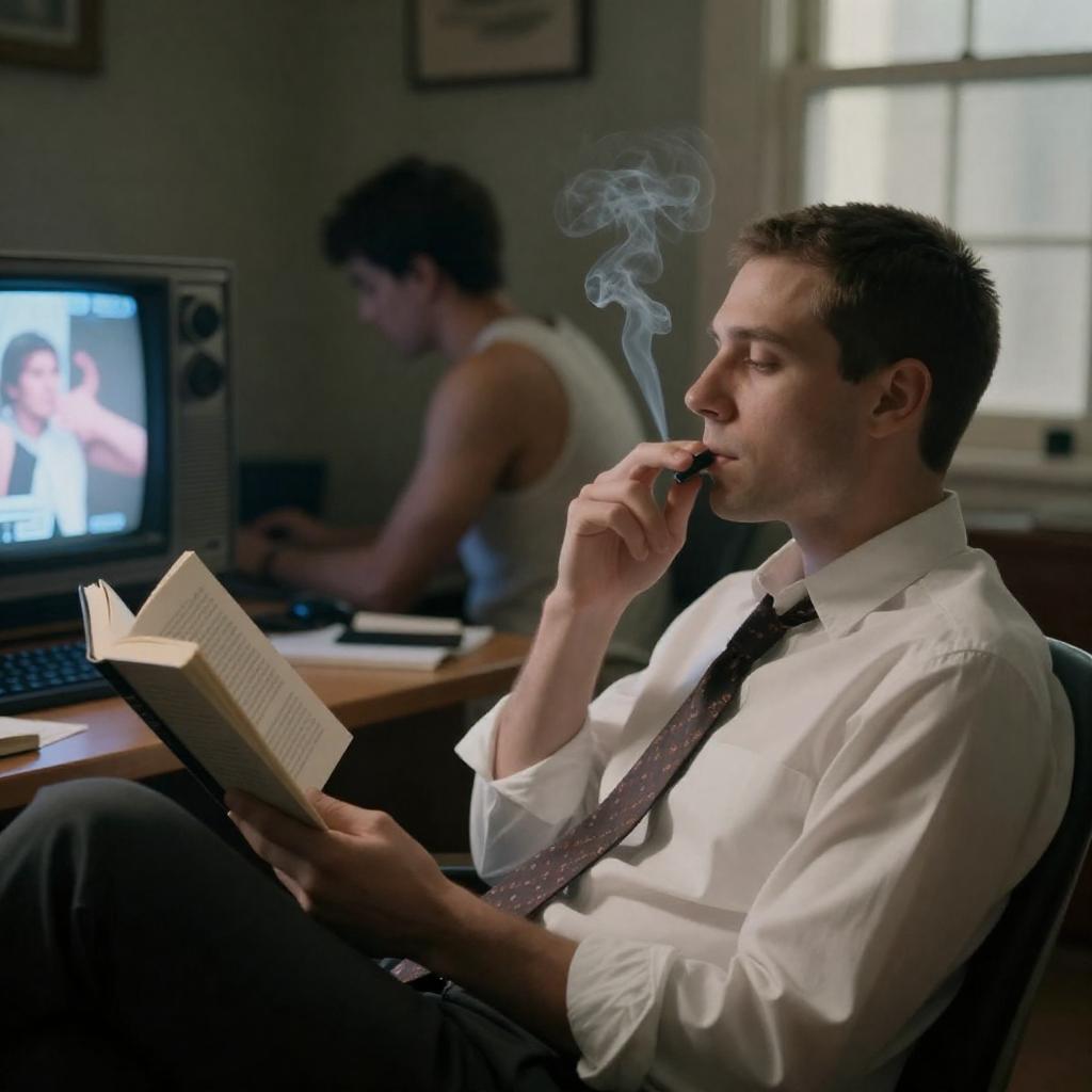 Man with medium-length brown hair, wearing a gray shirt and black tie, sitting on a bathroom toilet, holding a cigarette. White tiled walls, white sink, white towel, red towel on wall, tissue box on sink. Blue lighting. Slightly slouched posture, downcast eyes. Bathroom setting.