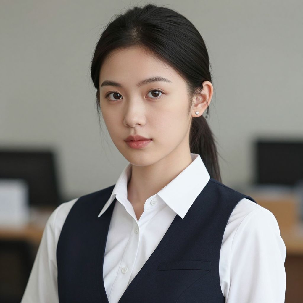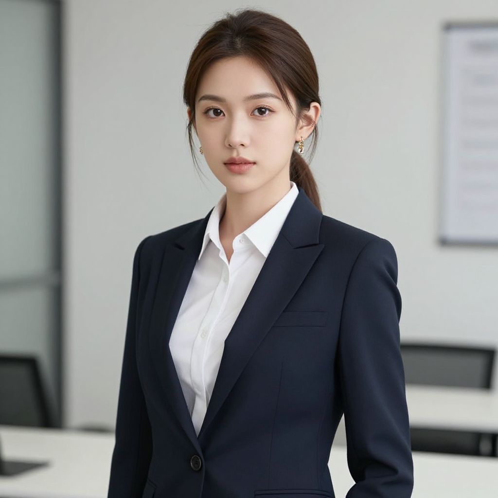 Photograph of an East Asian woman with long, straight, dark brown hair, wearing a black blazer over a white button-down shirt. She has a pink rose hair accessory on the right side of her head. Her expression is neutral, with slightly parted lips and dark, almond-shaped eyes. The background is softly blurred, featuring green and brown hues, suggesting an outdoor park setting. The lighting is natural, highlighting her fair skin tone. The overall style is modern and professional, with a focus on simplicity and elegance.