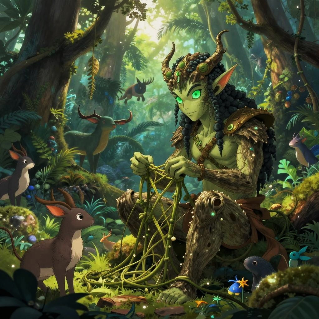 Digital artwork depicting a green-skinned, horned, elf-like creature with glowing green eyes and pointed ears, sitting cross-legged in a lush, enchanted forest. The creature has dark brown, braided hair and is adorned with moss and vines. It's weaving a web with its hands while surrounded by bioluminescent plants, colorful mushrooms, and a small, purple, bird-like creature. The forest is dense with tall trees and sunlight filtering through the canopy, creating a mystical atmosphere. The creature's expression is focused, and the overall color palette is rich with greens, blues, and vibrant accents.