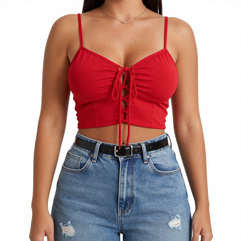 Photograph of a woman from the neck to the waist, wearing a bright red, spaghetti-strap, crop top with a lace-up front, revealing a hint of cleavage. She pairs it with high-waisted, light blue denim jeans that have distressed patches on the front. The jeans are secured with a black leather belt. She has a tan skin tone and long, dark hair. A thin, gold necklace is visible around her neck. The background is plain white, making her outfit the focal point. The image has a clear, sharp, and colorful aesthetic.
