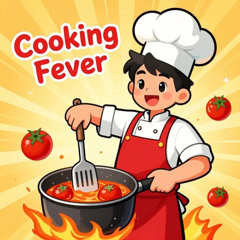 A vibrant cartoon-style illustration depicts a cheerful young chef in a white shirt and red apron, enthusiastically stirring a pot of simmering tomatoes with a spatula, set against a radiant golden-yellow background with dynamic flame effects, embodying the playful and energetic spirit of \"Cooking Fever.\