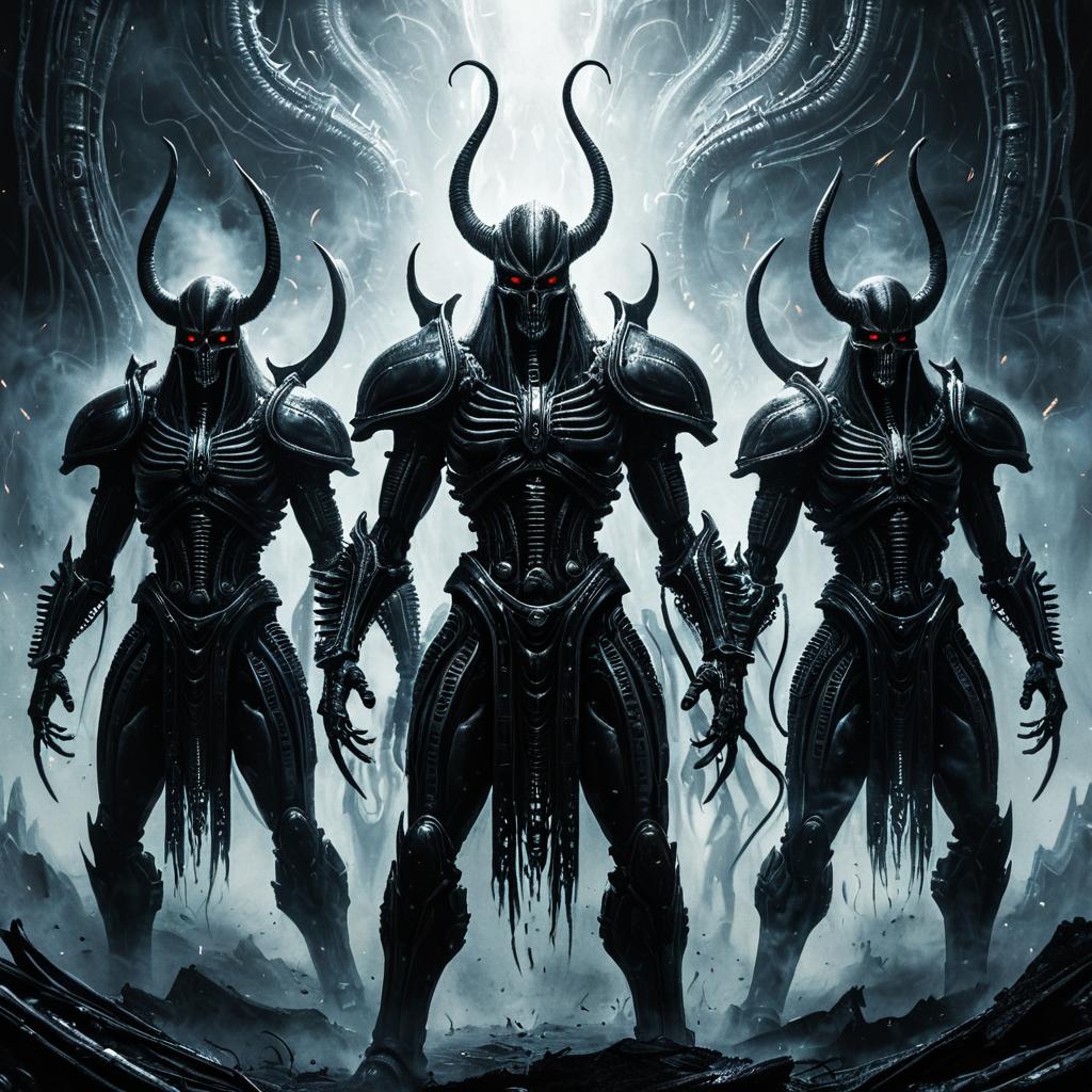 Epic fantasy oil painting in the style of Dark Souls, depicting shadowy knight hunters among fog-shrouded gothic spires under a blood red sky, cinematic panorama, hyperrealistic textures, volumetric lighting, 32K resolution.