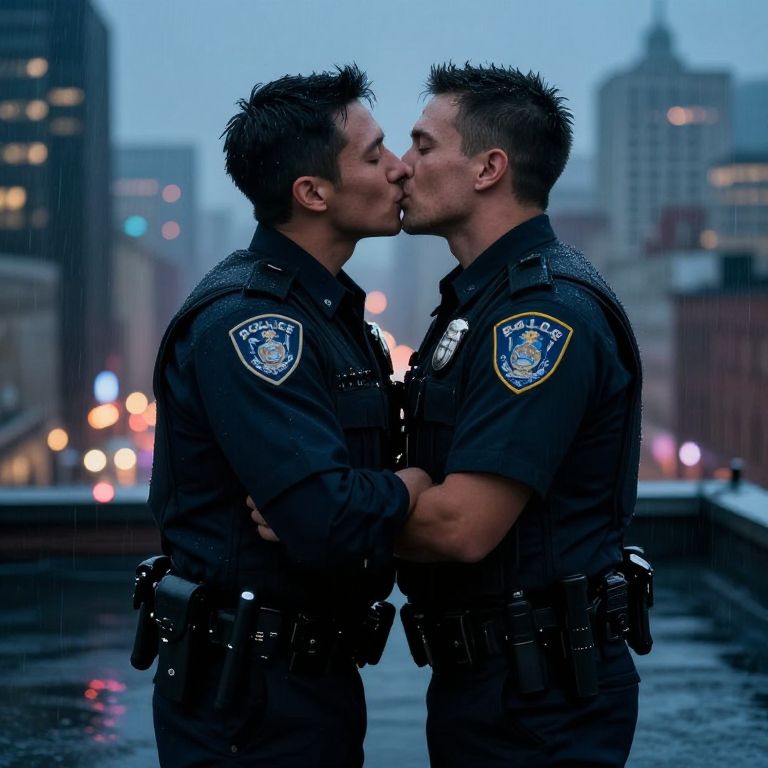 Two gay cops kissing tenderly on a rainy city rooftop, rain droplets reflecting colorful city lights, wearing detailed police gear, emotional intimacy captured in a cinematic style, moody atmosphere, high detail and realism