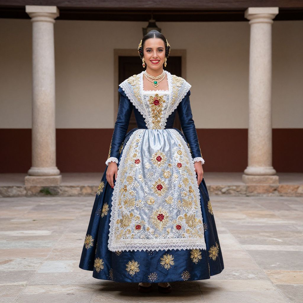 Photograph of a woman in traditional navy blue and white embroidered dress with lace trim, standing in an outdoor colonnaded courtyard.