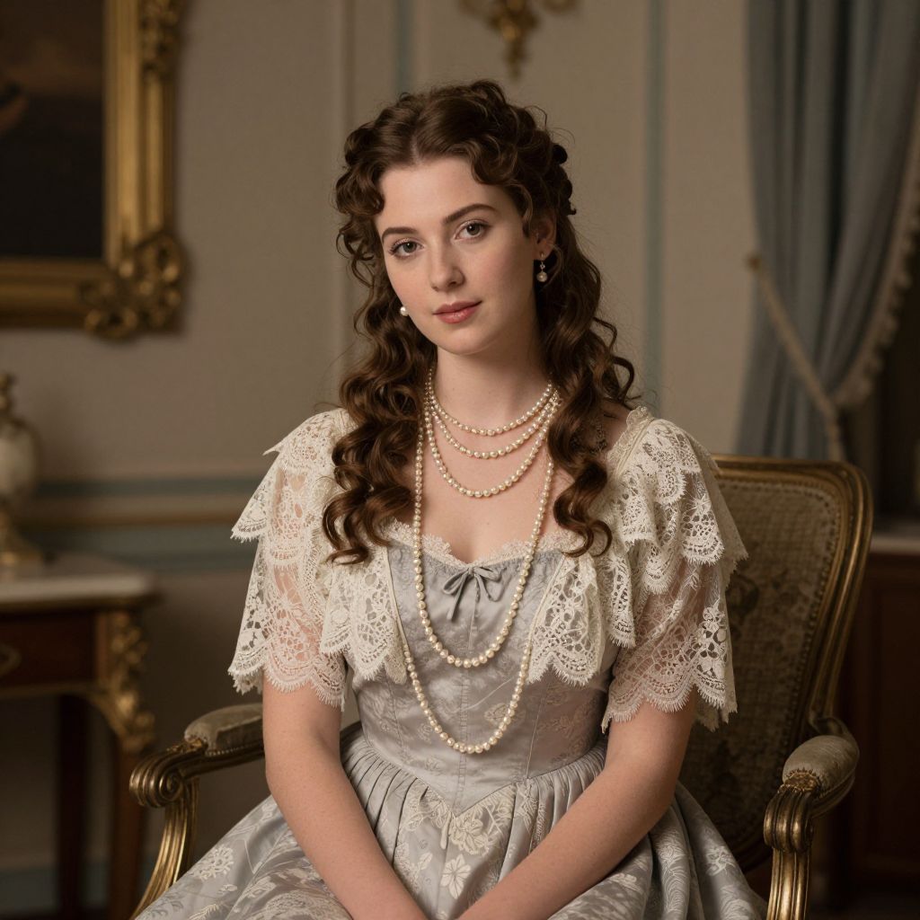 A vintage-inspired digital artwork portrays a woman seated elegantly in a classic interior, adorned in a lace-trimmed dress with pearl accents, evoking a timeless, high-definition aesthetic reminiscent of historical portraiture.