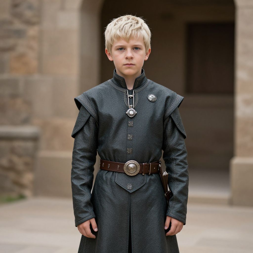 Photograph of a young boy with short, platinum blonde hair and fair skin, standing in front of a stone building. He wears a dark, textured, medieval-style tunic with puffed sleeves, a high collar, and a brown leather belt with a large, circular silver buckle. His expression is serious, and he has blue eyes. The background features a blurred stone archway and beige stone walls, adding to the historical ambiance. The boy's outfit and serious demeanor suggest a historical or fantasy theme. The lighting is natural, highlighting the textures of his clothing and the stone surroundings.