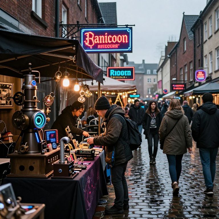 A cyberpunk renaissance punk street market bustling with augmented vendors, blending old-world craftsmanship and advanced technology, neon signs in renaissance fonts, steam-powered machines alongside cybernetic enhancements, rain-soaked cobblestone streets
