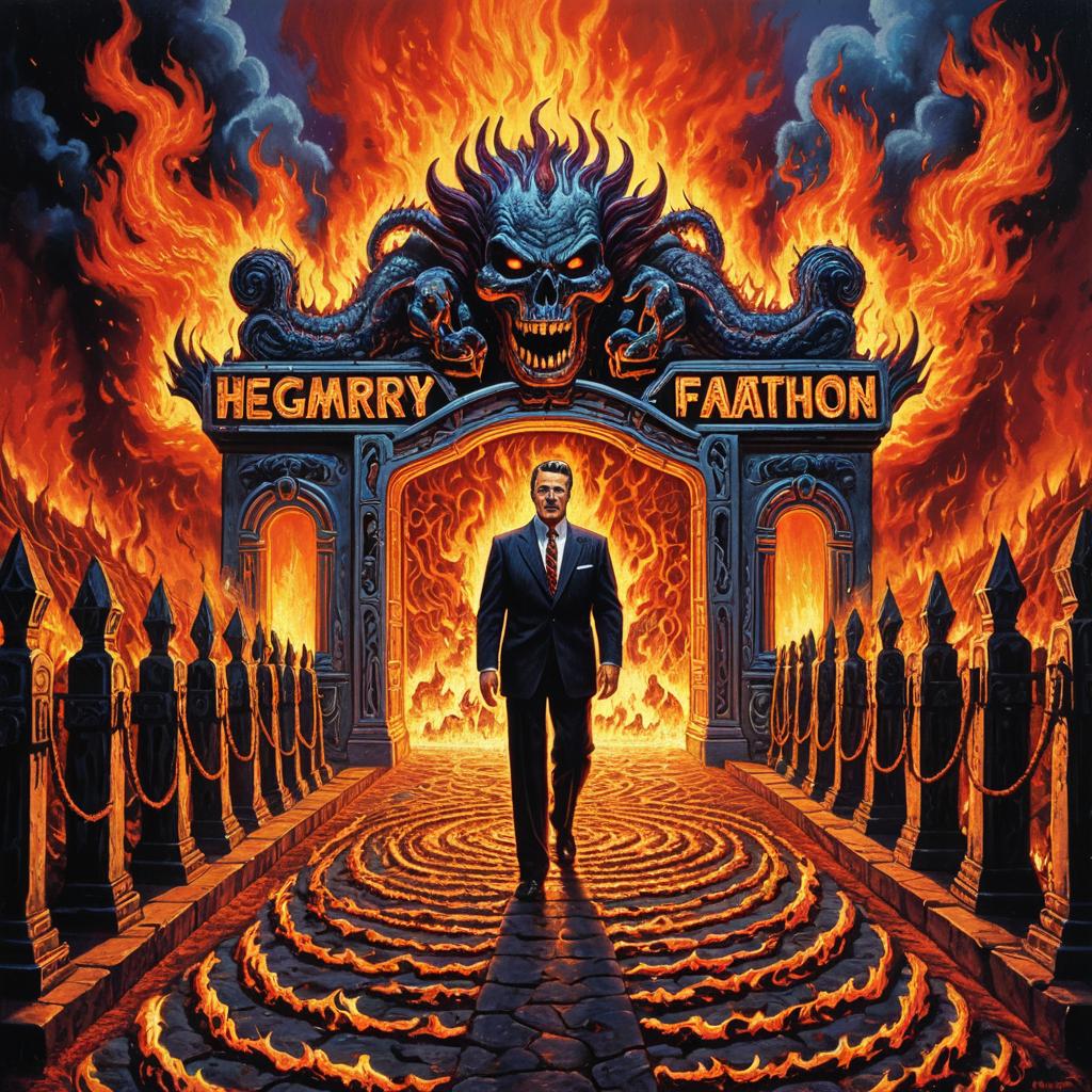 A highly detailed, cinematic horror painting featuring a 1950s-style gameshow host in a dark suit and tie, confidently walking along a fiery pathway. The path leads to an elaborate gate adorned with demonic skull and snake sculptures, engulfed in massive, apocalyptic flames. The surrounding environment is intense with swirling fire and shadows, conveying an epic fantasy and horror atmosphere.