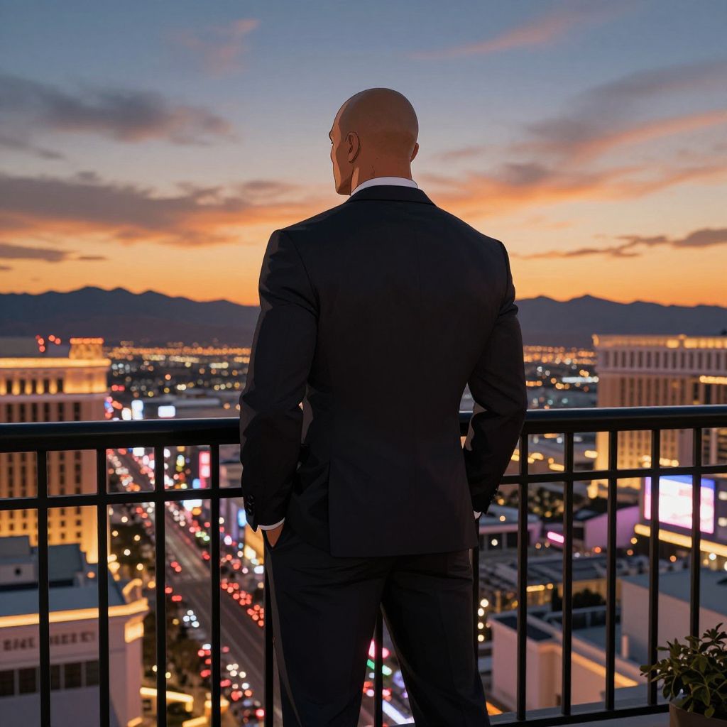 In this vivid, cinematic anime-style image, a bald, athletically built man with a muscular build is seen from behind, wearing an Italian suit, standing on a balcony overlooking the bustling lights of the Las Vegas strip. The man's posture is relaxed yet commanding, with his hands casually placed in his pockets. The balcony railing is black, contrasting with the warm, golden hues of the sunset sky, which is filled with clouds that blend shades of orange and blue. The cityscape below is a vibrant array of lights, with tall buildings and a prominent hotel tower standing out against the horizon. The mountains in the distance add a sense of depth and grandeur to the scene, while the interplay of light and shadow creates a dramatic and atmospheric mood. The overall composition is balanced, with the man positioned centrally, drawing the viewer's eye through the scene and emphasizing the grandeur of the cityscape.