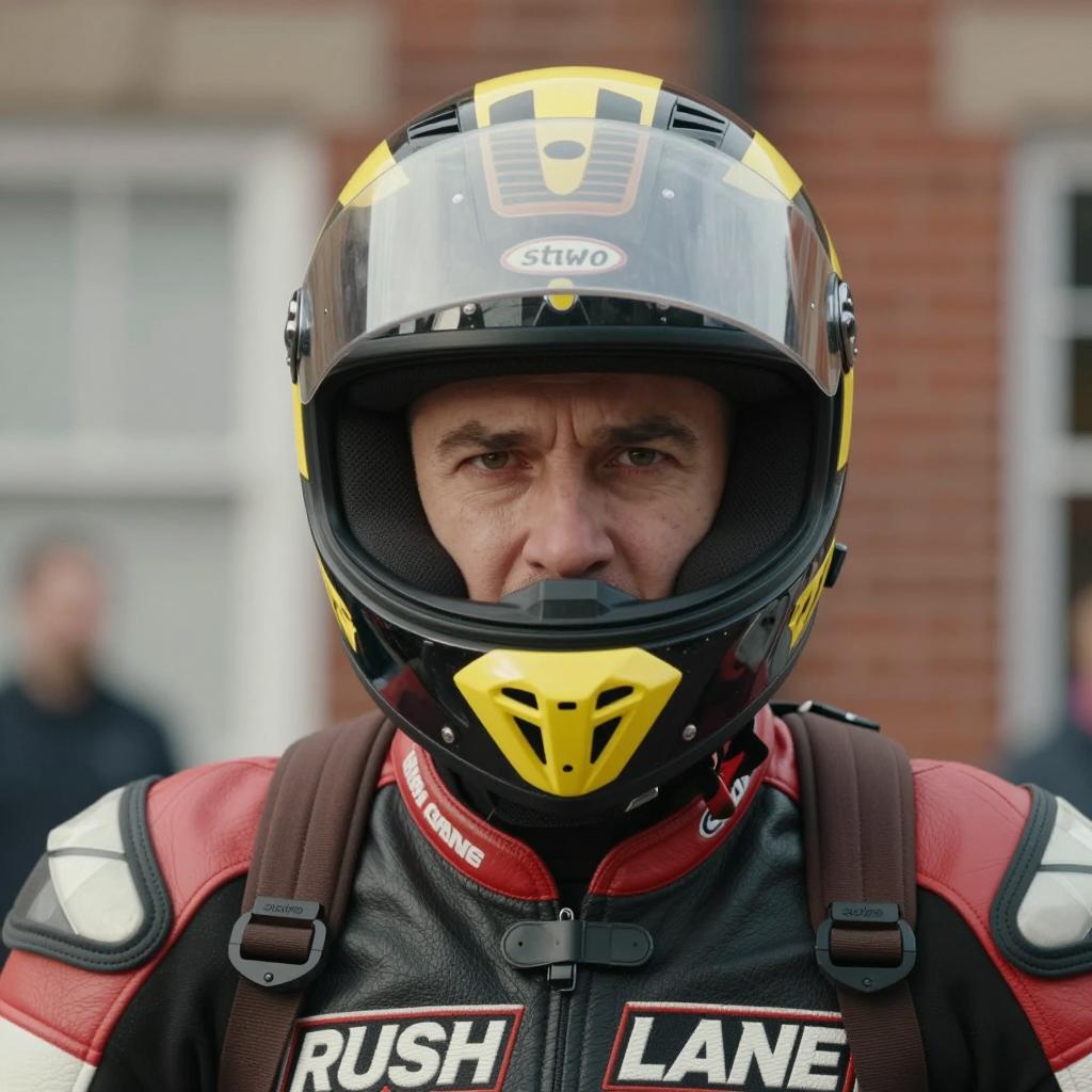 Stig top gear costume, photorealistic portrait of a man wearing a black motorcycle helmet with yellow accents, intense expression, black and red jacket with brown straps, "Rush Lane" on jacket, blurry outdoor background with brick building, sunlight, medium close-up, focused on face, sharp details, cinematic style, realistic lighting, slightly shadowed eyes