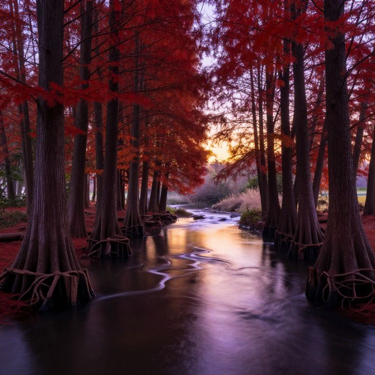 Liquid light cascades through a serene forest, where towering trees with vibrant red foliage frame a tranquil river, their roots firmly planted along the banks, reflecting soft hues of violet and gold as the sun sets in the distance.