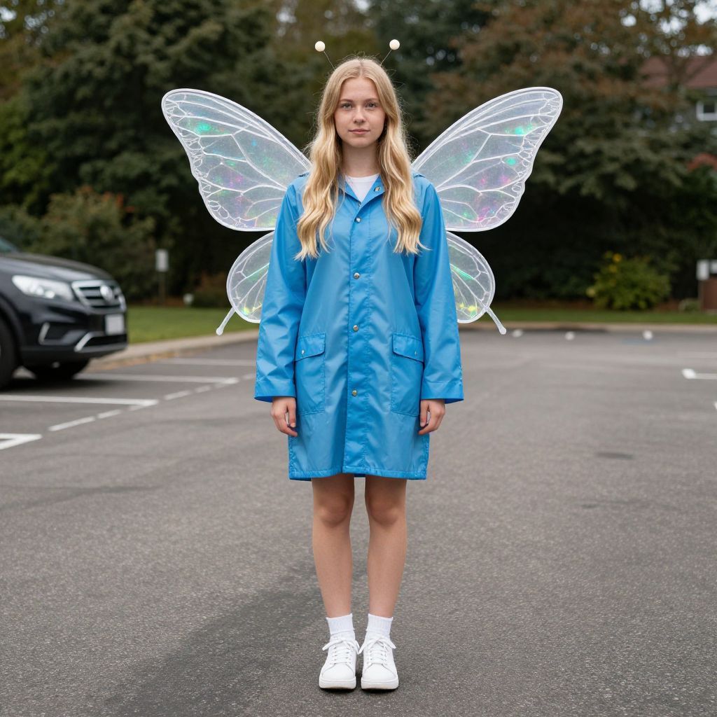 Space Fairy Costume, dressed in a blue raincoat standing in a parking lot