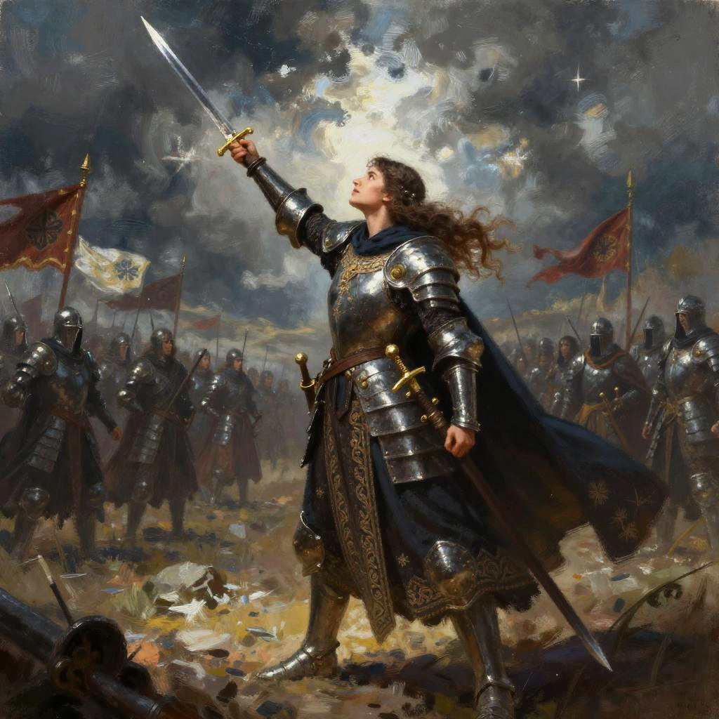 Imperatriz commanding a mystical army on a vast battlefield, clad in medieval inspired armor with intricate embroidery and a flowing cape, dramatic stormy skies, swords and banners waving, epic fantasy atmosphere painted in dynamic, detailed brushstrokes