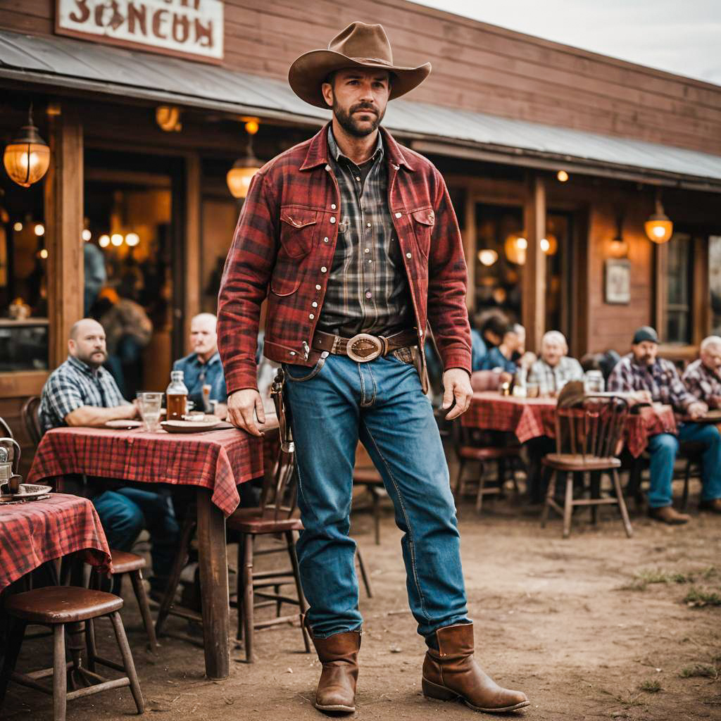 Rugged build man wearing a cowboy outfit including a hat, plaid shirt, leather belt with a large buckle, and jeans standing in a rustic western-style diner. The background features wooden walls, vintage lighting, and patrons seated at tables, enhancing the cinematic western atmosphere.